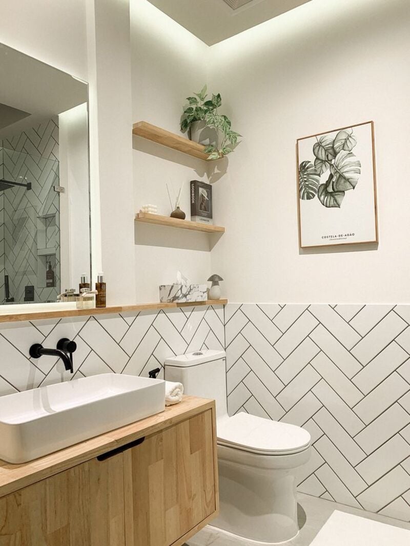 Trong một số trường hợp, để tạo điểm nhấn, bạn có thể sử dụng các loại gạch ốp tường có kích thước nhỏ hơn như gạch thẻ, gạch mosaic, hoặc gạch có họa tiết độc đáo. Tuy nhiên, nên sử dụng chúng một cách có chọn lọc, chỉ ở các khu vực nhất định như khu vực gương, vòi sen, hoặc chân tường, để tránh làm không gian trở nên rối mắt.