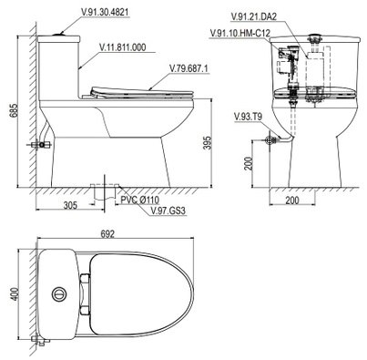 Bản vẽ bệ xí bệt V811 Viglacera 1 khối