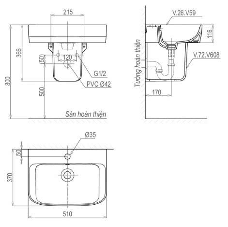 Bản vẽ chậu lavabo treo tường Viglacera V59: