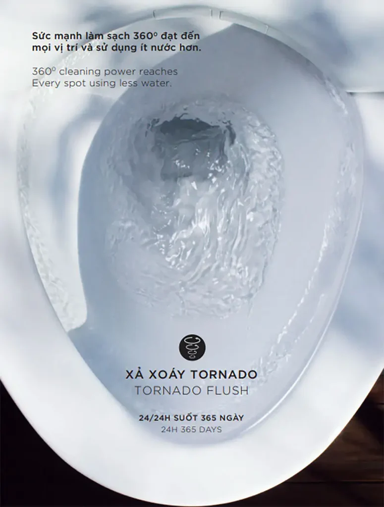 1. Hiệu Quả Làm Sạch Đạt Mức Tối Đa: Khả năng làm sạch 360 độ của Tornado Flush đảm bảo bồn cầu luôn sạch sẽ, giảm thiểu tối đa việc sử dụng chất tẩy rửa hóa học.